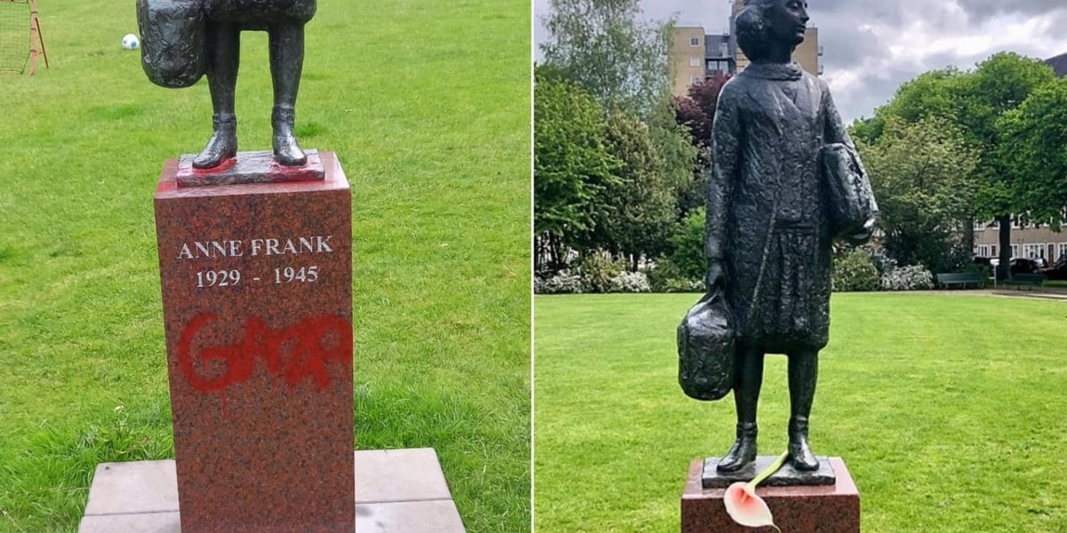 De acordo com a CNN, a pichação foi feita com tinta vermelha na base da estátua em um parque, localizada próximo a casa que Anne e sua família moravam antes de serem obrigados a se esconderem do regime nazista.
