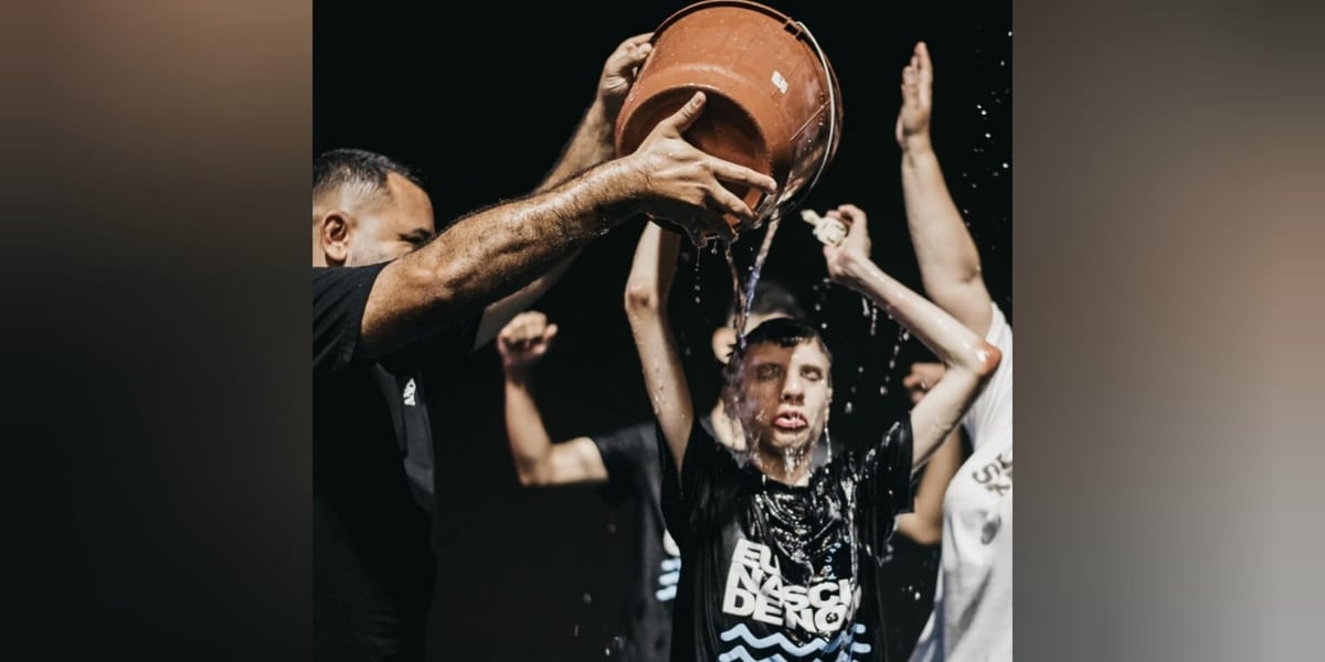 Ele celebrou pulando e levantando os braços ao ser batizado com um balde de água no tanque batismal.