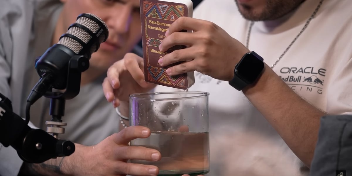 No podcast, os apresentadores mergulharam a Bíblia em um recipiente com água para demonstrar que ela não é danificada.